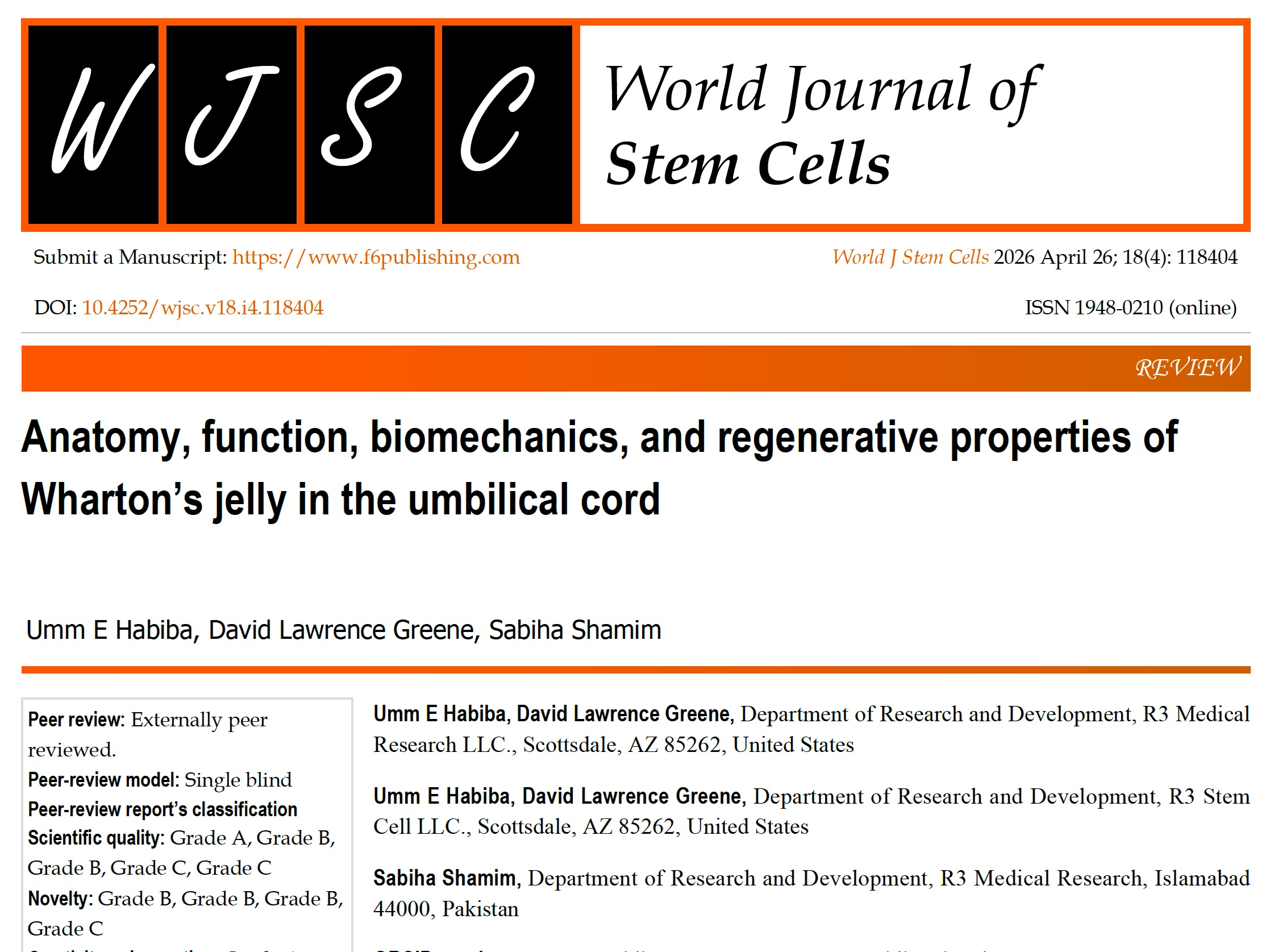 SCOTTSDALE, AZ, UNITED STATES, April 20, 2026 /EINPresswire.com/ -- R3 Medical Research and R3 Stem Cell today announced the publication of a peer-reviewed review article titled “Anatomy, function, biomechanics, and regenerative properties of Wharton’s jelly in the umbilical cord” in the World Journal of Stem Cells (Vol. 18, Issue 4, 2026; DOI: 10.4252/wjsc.v18.i4.118404).